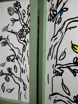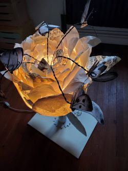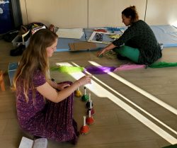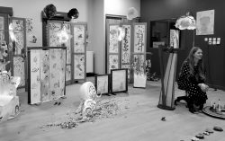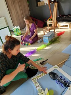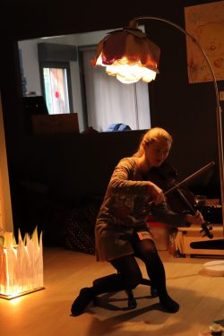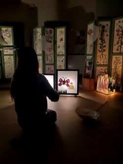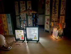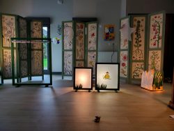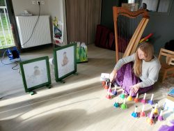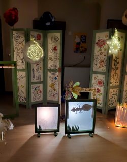 Résidence d’artistes pluridisciplinaire entre une plasticienne et une musicienne. L’idée de cette rencontre est de créer une représentation adaptée au très jeune public sur le thème de la nature et du vivant. Sur la scène, une musicienne accompagnée de sa voix, ses instruments, est entourée d’un décor mobile, dessiné, et peint. Louise Meurisse s’appuie sur un répertoire de comptines connues et de compositions personnelles. C’est en chantant qu’elle s’accompagne de son violon et de sa harpe. J’ai mis mon regard au service de cette partition pour accompagner les mots, les temps, les sons, créant ainsi l’univers visuel d’un jardin aux miniatures qui dansent au clair de lune. 🌙⭐