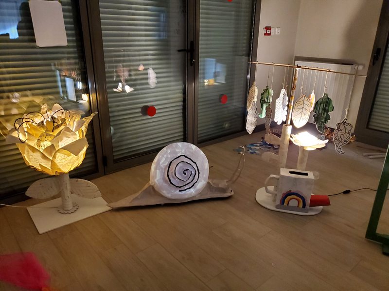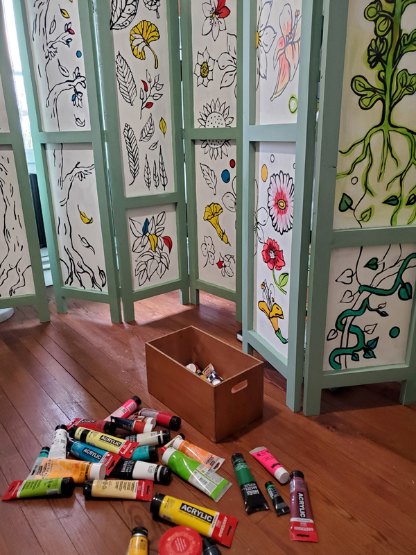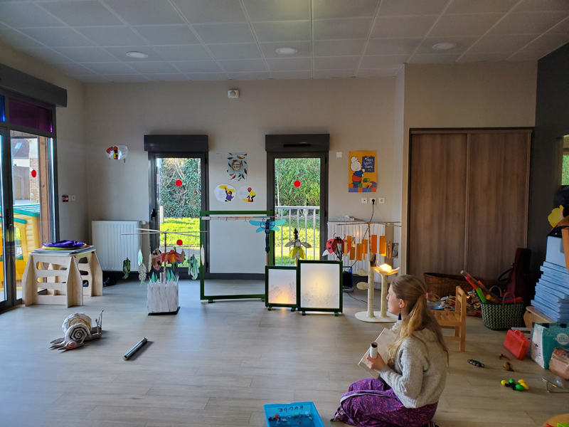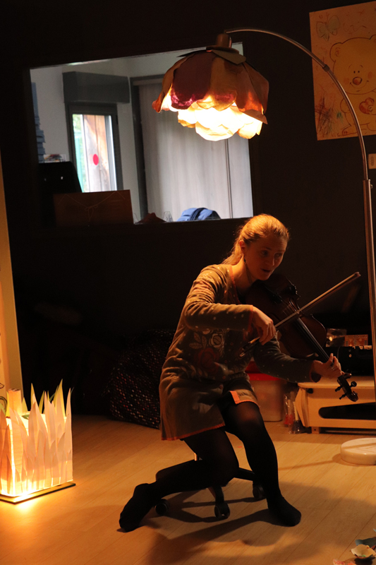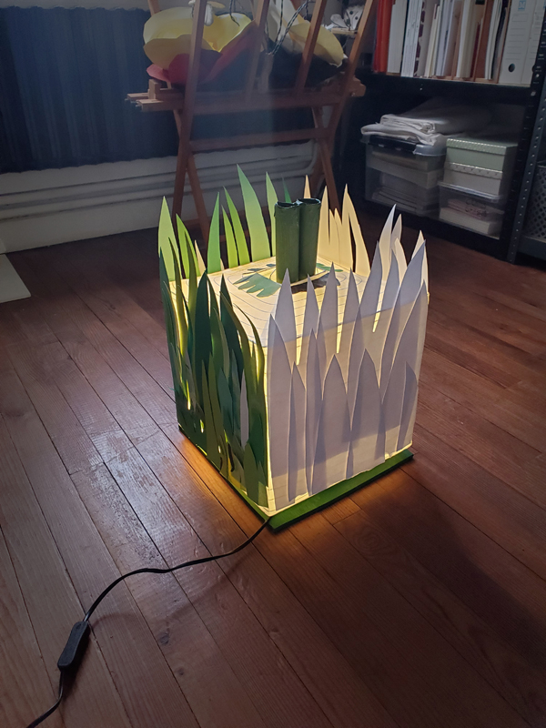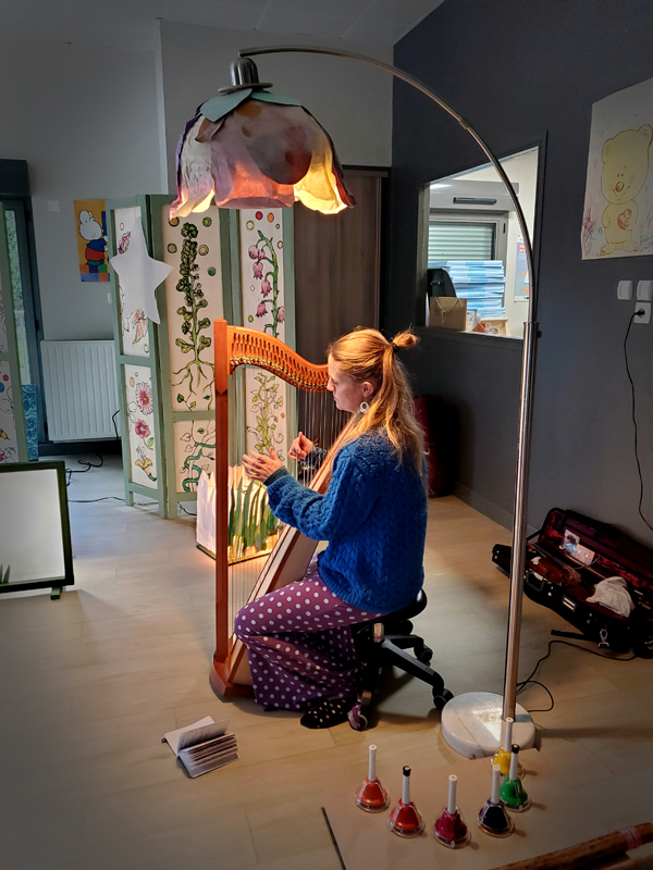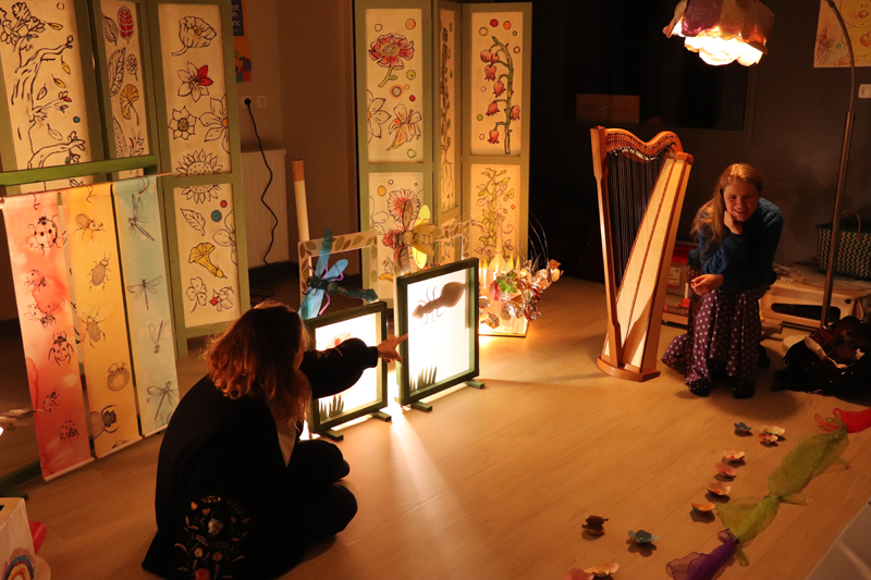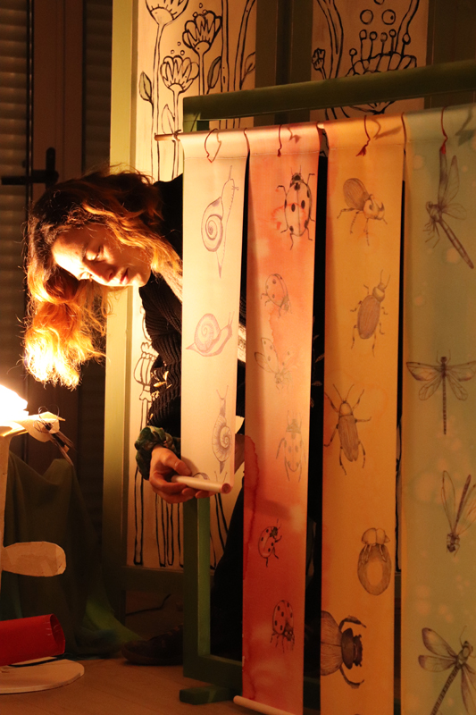 Résidence d’artistes pluridisciplinaire entre une plasticienne et une musicienne. L’idée de cette rencontre est de créer une représentation adaptée au très jeune public sur le thème de la nature et du vivant. Sur la scène, une musicienne accompagnée de sa voix, ses instruments, est entourée d’un décor mobile, dessiné, et peint. Louise Meurisse s’appuie sur un répertoire de comptines connues et de compositions personnelles. C’est en chantant qu’elle s’accompagne de son violon et de sa harpe. J’ai mis mon regard au service de cette partition pour accompagner les mots, les temps, les sons, créant ainsi l’univers visuel d’un jardin aux miniatures qui dansent au clair de lune. 🌙⭐